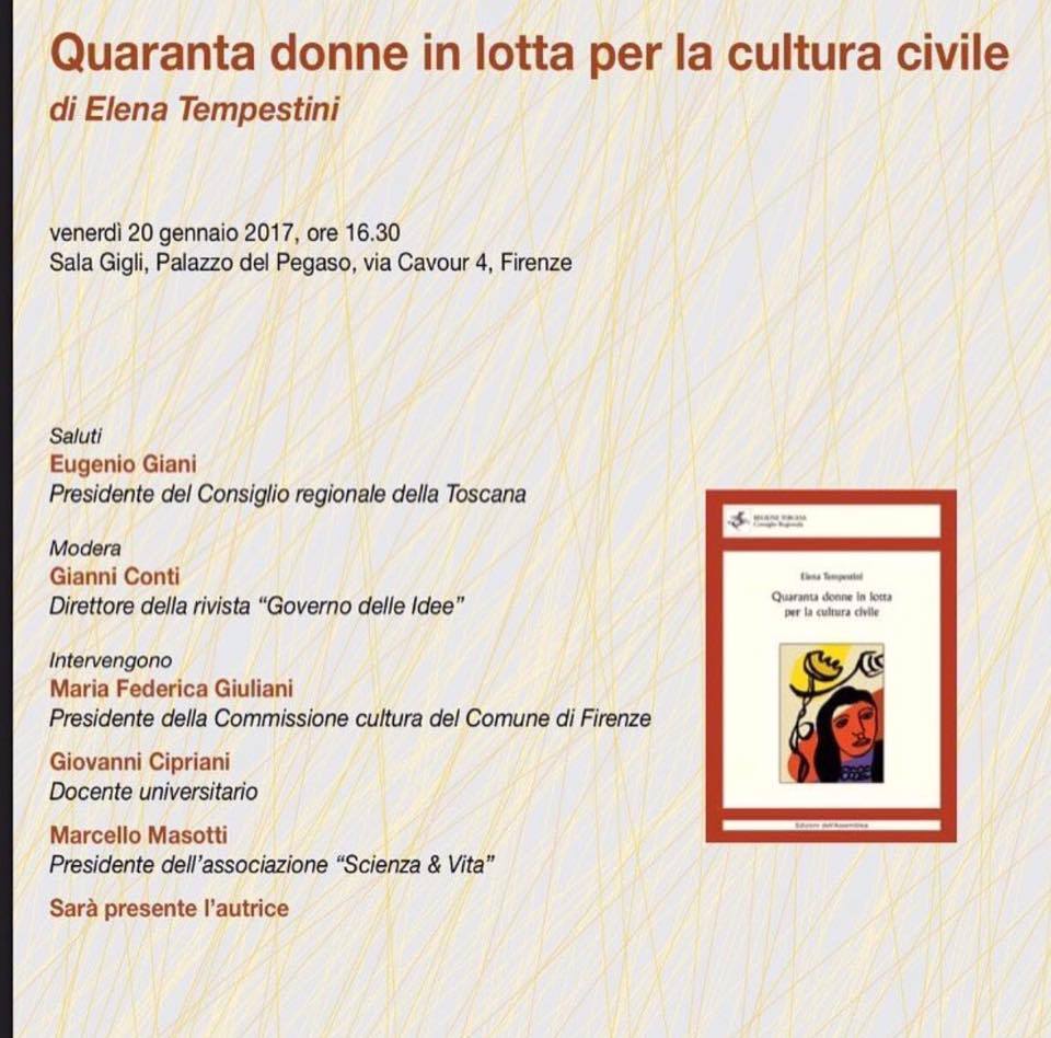 Per Elena Tempestini, con la presentazione del suo libro, inizia oggi un percorso, nel racconto straordinario di quaranta donne e il ruolo della donna svolto fra Ottocento e Novecento nei campi più disparati, il racconto di donne che hanno capito in anticipo la grande sfida giocata e spinta da diversi fattori in cui le donne sono una delle più grandi opportunità di business del XXI secolo, percependo che il successo di una azienda, del lavoro, della cultura, della società sta nell’equilibrio dei sessi e nella valorizzazione dei talenti nel rispetto delle diversità.