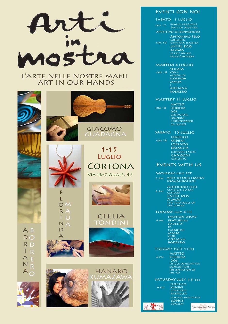 Il 1 luglio 2017 ci sarà l’inaugurazione dell’evento “Cortona Arti in Mostra, l’arte nelle nostre mani” alle ore 17:00 con aperitivo e concerto del Maestro Antonino Lelo in Via Nazionale 47, Cortona.