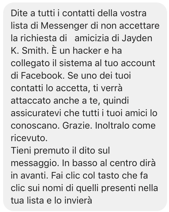 Dite a tutti i contatti della vostra lista di Messenger di non accettare la richiesta di amicizia di Jayden K. Smith. È un hacker e ha collegato il sistema al tuo account di Facebook. Se uno dei tuoi contatti lo accetta, ti verrà attaccato anche a te, quindi assicuratevi che tutti i tuoi amici lo conoscano. Grazie. Inoltralo come ricevuto.