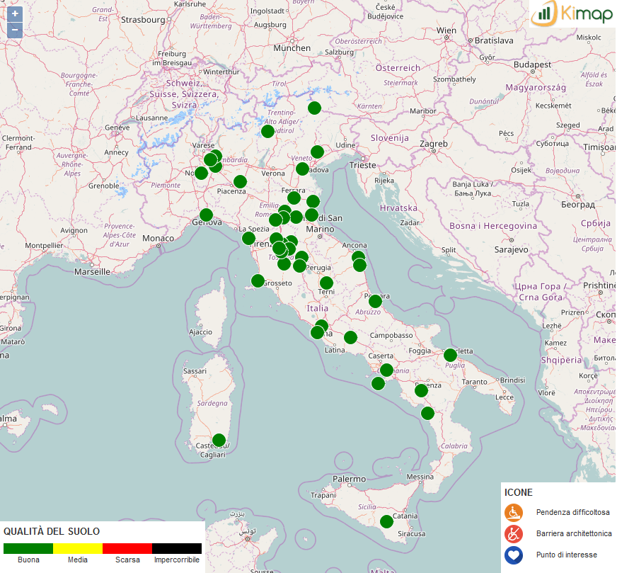 Il Progetto Kimap ha come obiettivo quello di segnalare in tempo reale e in modo automatico i percorsi accessibili per le persone che si muovono in sedia a rotelle sia nei contesti urbani che in quelli extraurbani e al tempo stesso di segnalare la presenza di barriere all’accessibilità indicando la strada migliore da percorrere.
