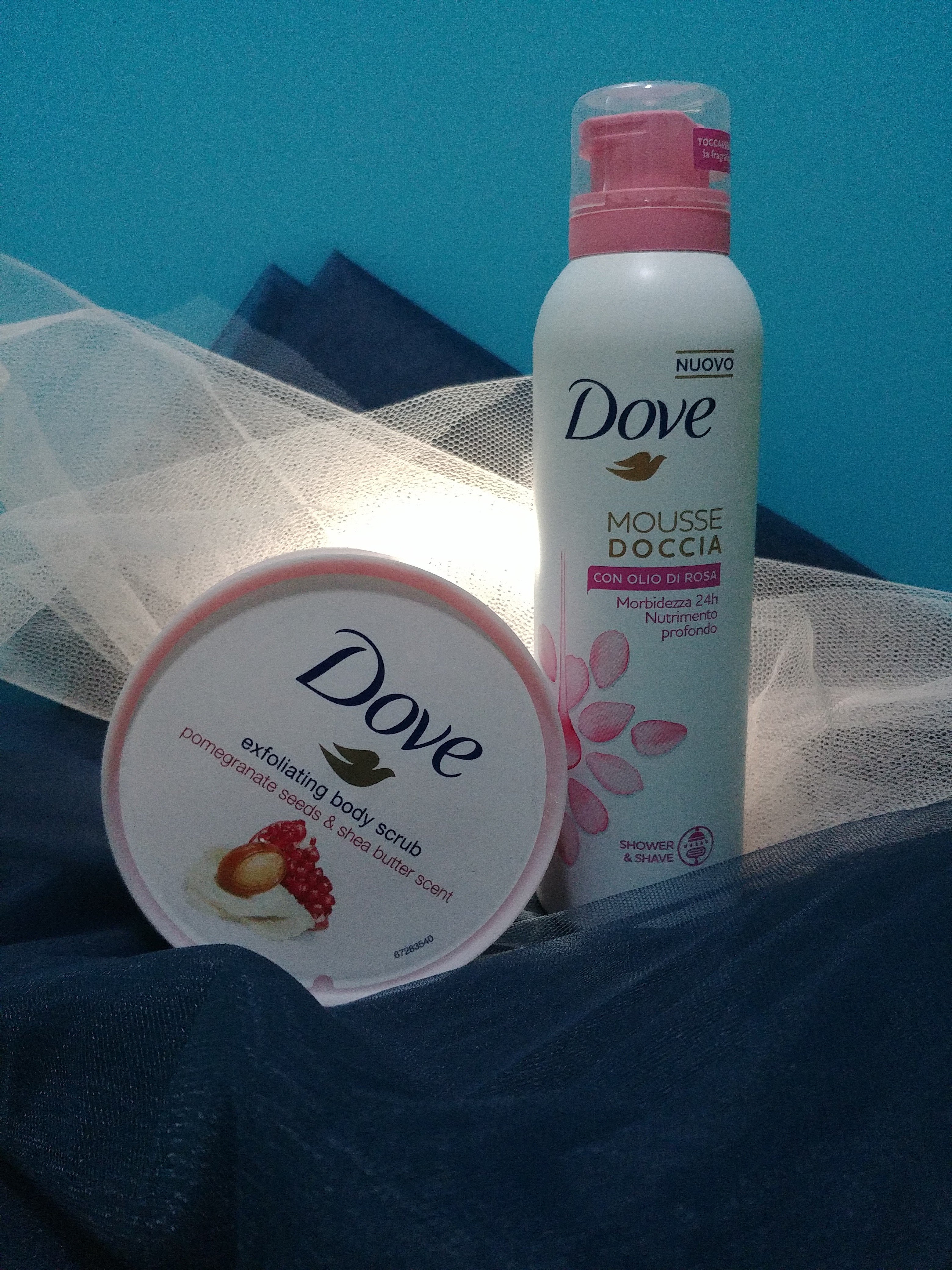 Dove mousse doccia con olio di rosa e Scrub Dove con semi di Melograno e Burro di Karitè.