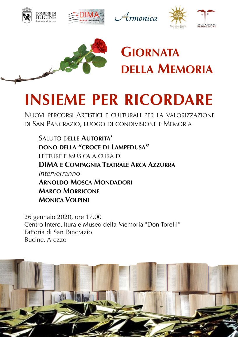 Sull’onda di questa collaborazione che oggi vede anche la presenza della Fondazione Casa dello Spirito e della Arti di Arnoldo Mosca Mondadori, il Comune di Bucine organizza un evento dedicato al tema della memoria nel Centro Interculturale e Museo della Memoria “Don G. Torelli” (Fattoria di San Pancrazio) di San Pancrazio, Bucine (AR), per iniziare un percorso di rivalutazione del luogo come museo, residenza artistica, laboratorio permanente di formazione e produzione.