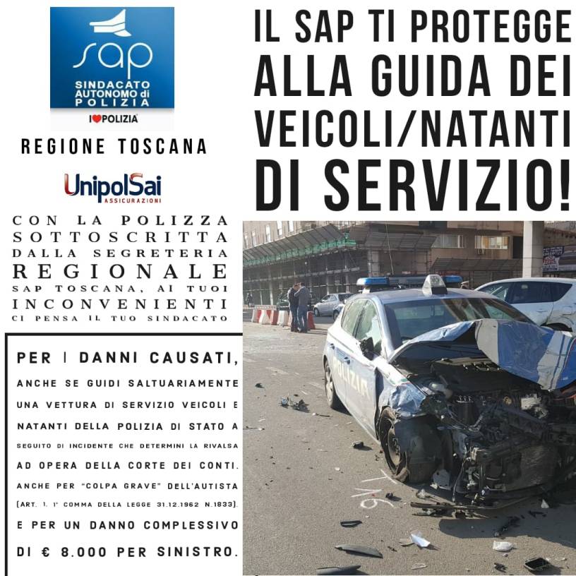 La Segreteria Regionale Toscana del Sap, Sindacato Autonomo di Polizia ha deciso di stipulare una polizza assicurativa a favore di tutti i propri associati per i danni arrecati ai mezzi di servizio dovuti a responsabilità non dolosa del conducente.