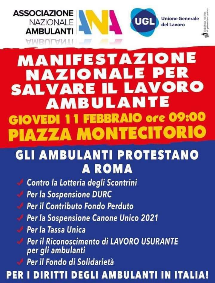 Giovedì 11 febbraio 2021 l’Associazione Nazionale Ambulanti Ugl scenderà a Roma per manifestare in piazza Montecitorio per non continuare ad essere dimenticati come fossimo i figli di un Dio Minore.
