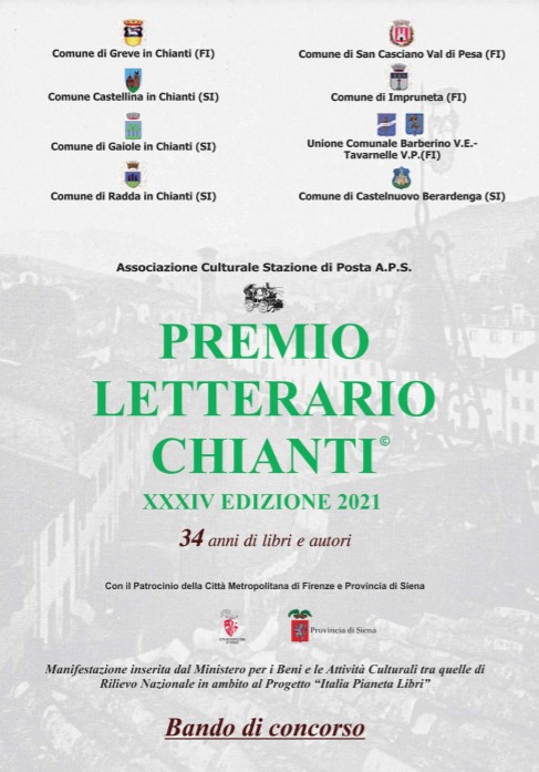 la XXXIV Edizione del PREMIO LETTERARIO CHIANTI, riservato ad Opere di narrativa in lingua italiana, edite dal 1 luglio 2019 al 31 dicembre 2020. Le Case Editrici, nonché gli Autori a titolo personale, che intendano partecipare al Premio dovranno inviare n° 16 copie di ciascuna opera, entro e non oltre il 15 marzo 2021, alla BIBLIOTECA COMUNALE DI GREVE IN CHIANTI, PIAZZA TERRA MADRE, 50022 GREVE IN CHIANTI (FI). Sulle scatole contenenti i libri inviati dovrà essere posta la dicitura: PREMIO LETTERARIO CHIANTI XXXIV EDIZIONE 2021.