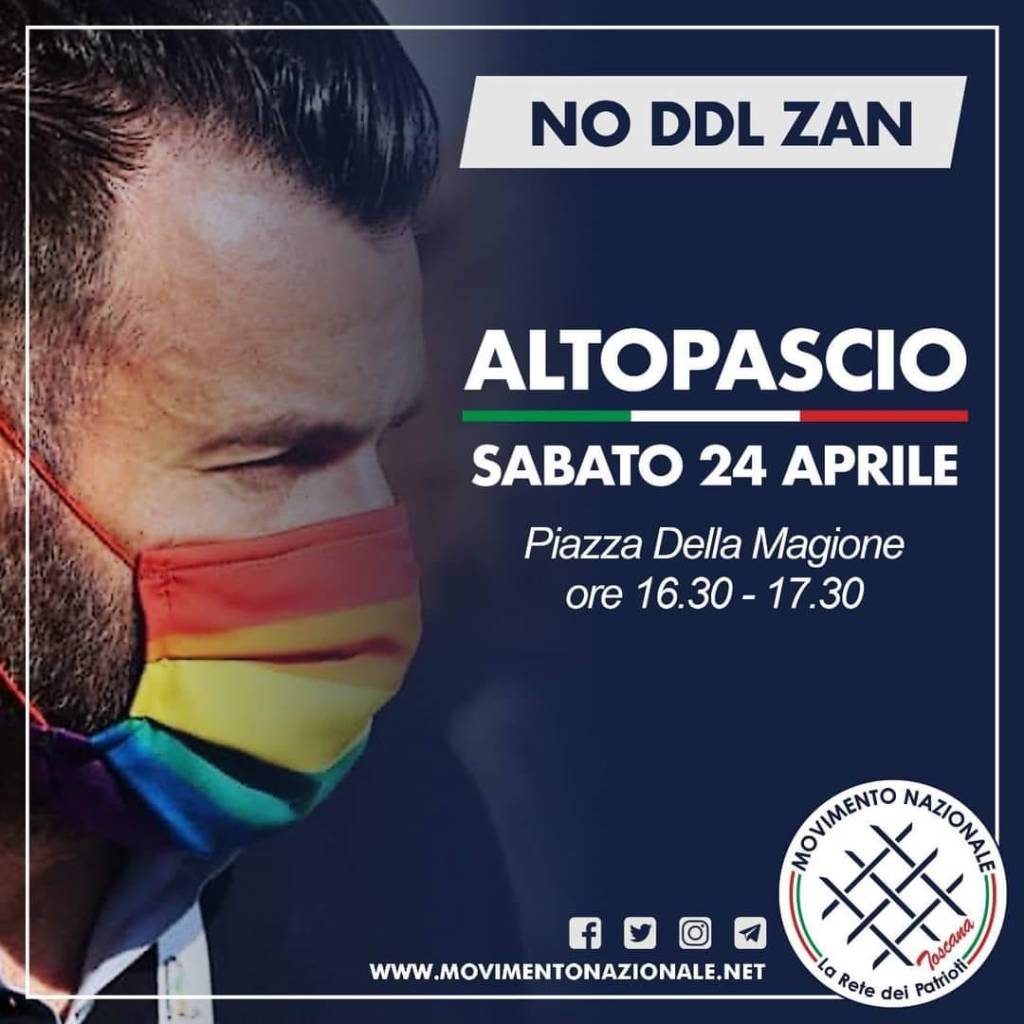 Manifestazione ad Altopascio contro il DDL ZAN del Movimento Nazionale La Rete dei Patrioti Sabato 24 Aprile 2021, ore 16,30, piazza della Magione, Altopascio
