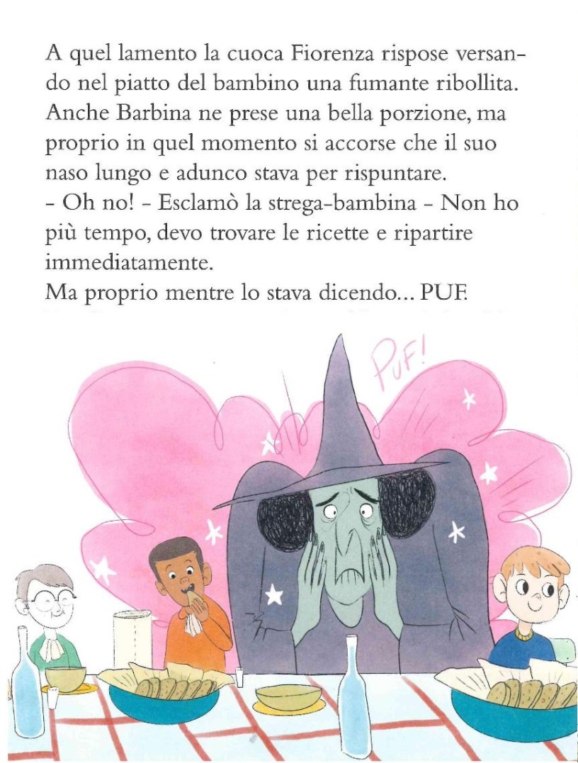 A tutti sarà consegnato questo dono con la storia della maestra strega Barbina, la quale per accontentare i suoi bambini a tavola viaggia alla ricerca di nuove ricette, per comprendere che, alla fine, il metodo da preferire è di assaggiare e sperimentare le pietanze, per poi condividere con i bambini il ‘cum panis’, lo stesso pane, ovvero confrontarsi, parlare, condividere idee e sogni attorno alla mensa. La streghetta colorata si trasformerà in una bambina per passare inosservata tra gli alunni della scuola ma, alla fine del racconto, l’incantesimo terminerà svelandola davanti agli occhi di tutti con le sue sembianze da strega.