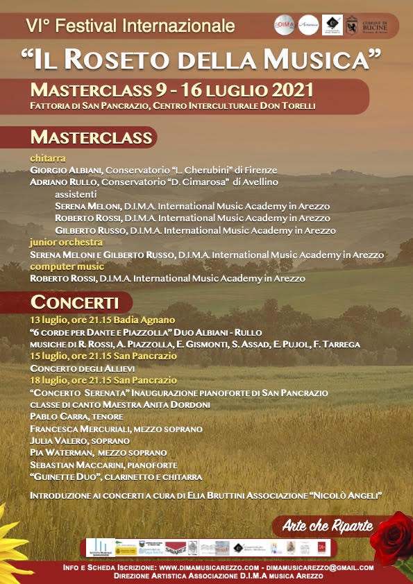 Dal 9 al 16 luglio prossimo, il Centro Interculturale Don Giuseppe Torelli e Museo della Memoria di San Pancrazio, nel Comune di Bucine, ospiterà il VI° Festival Internazionale IL ROSETO DELLA MUSICA – Masterclass e Concerti, ideato e realizzato, per il sesto anno dopo l’interruzione del 2020 dovuta all’emergenza sanitaria da Covid19, dall’Associazione Culturale D.I.M.A. – DoReMi International Music Academy di Arezzo, l’Amministrazione comunale di Bucine, la collaborazione dell’Associazione Armonica Onlus e Eva con Eva Onlus nell’ambito del patto di progetto Beni Comune Bucine.