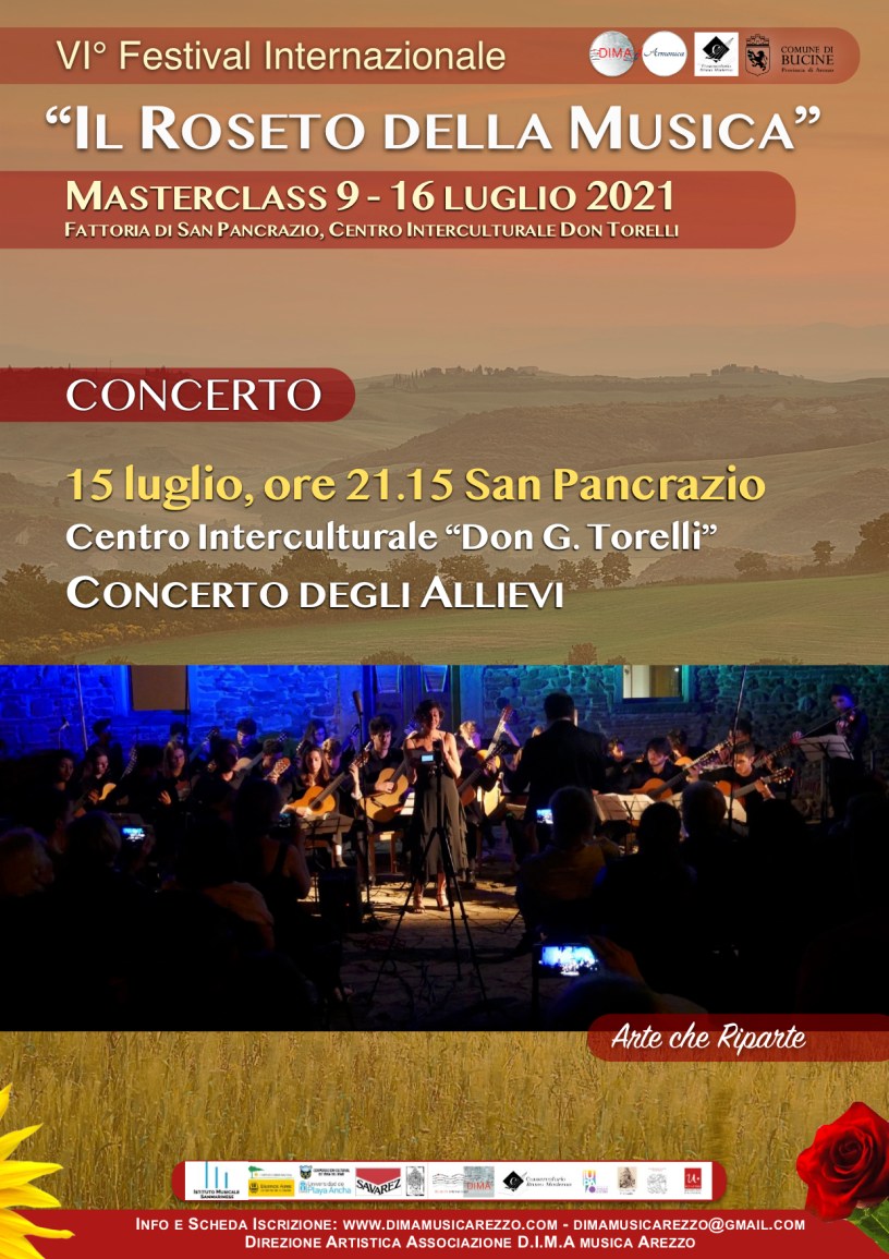 Giovedì 15 luglio alle ore 21.15, al Centro Interculturale “Don G. Torelli” di San Pancrazio (in caso di maltempo l’evento si svolgerà all’interno della chiesa del paese) si terrà il Concerto finale, del VI° edizione del Festival Internazionale Il Roseto della Musica 2021 – Masterclass e Concerti nella Val d’Ambra aretina. In collaborazione con il Comune di Bucine, Armonica Onlus, Eva con Eva Onlus per il progetto Beni Comuni Bucine.