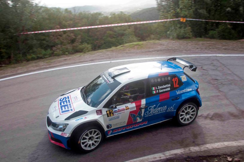 Nelle foto (free copyright Thomas Imagery): l’equipaggio Luca Cecchettini-Paolo Garavaldi in gara su Skoda Fabia R5 ed in primo piano.