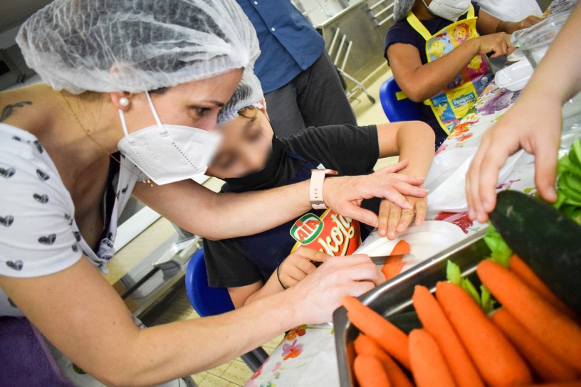 Il primo appuntamento, lunedì 23 maggio, era rivolto ai bambini delle classi prime delle primarie Sturiale e Paolieri. Tredici bambini, con un genitore ciascuno, hanno preparato un menù elaborato sulla base di ciò che hanno coltivato a scuola durante l’attività “Orto a Scuola” (fragole, bietole, barbe rosse, insalata, carote). Il menù per questa giornata è stato: crudités di carote, humus di barbabietole rosse, sformato di bietole, macedonia di frutta mista con fragole.