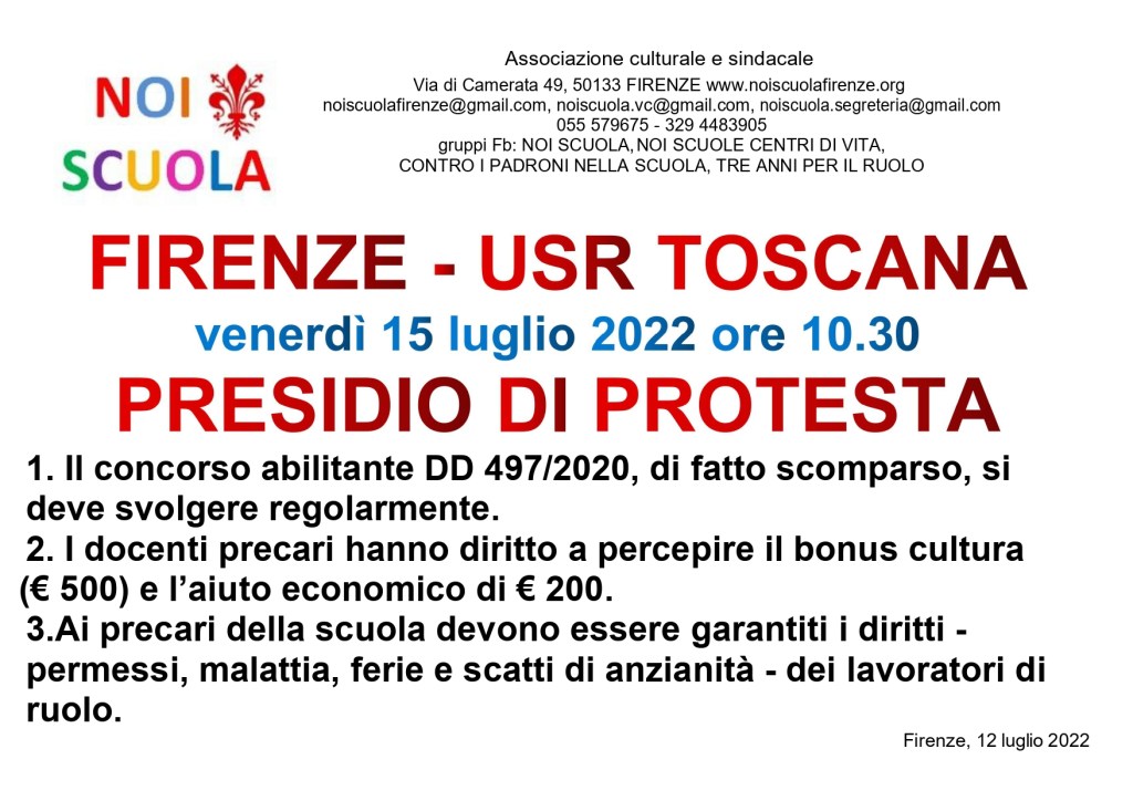 FIRENZE – NOI SCUOLA ha indetto per venerdì 15 alle ore 10.30 davanti a USR TOSCANA una manifestazione di protesta per rivendicare i diritti dei lavoratori precari e contro le illegalità del ministro Bianchi: tacito annullamento di fatto del concorso abilitante DD 497/2020 – visto che proprio il 15 luglio ricorre il secondo infausto anniversario dalla scadenza delle iscrizioni al concorso da parte di circa centomila docenti precari e di ruolo, delle scuole statali e delle paritarie – e conseguente fattispecie di peculato, per distrazione dalla destinazione di legge della somma di oltre un milione di euro delle iscrizioni (15 euro procapite).
