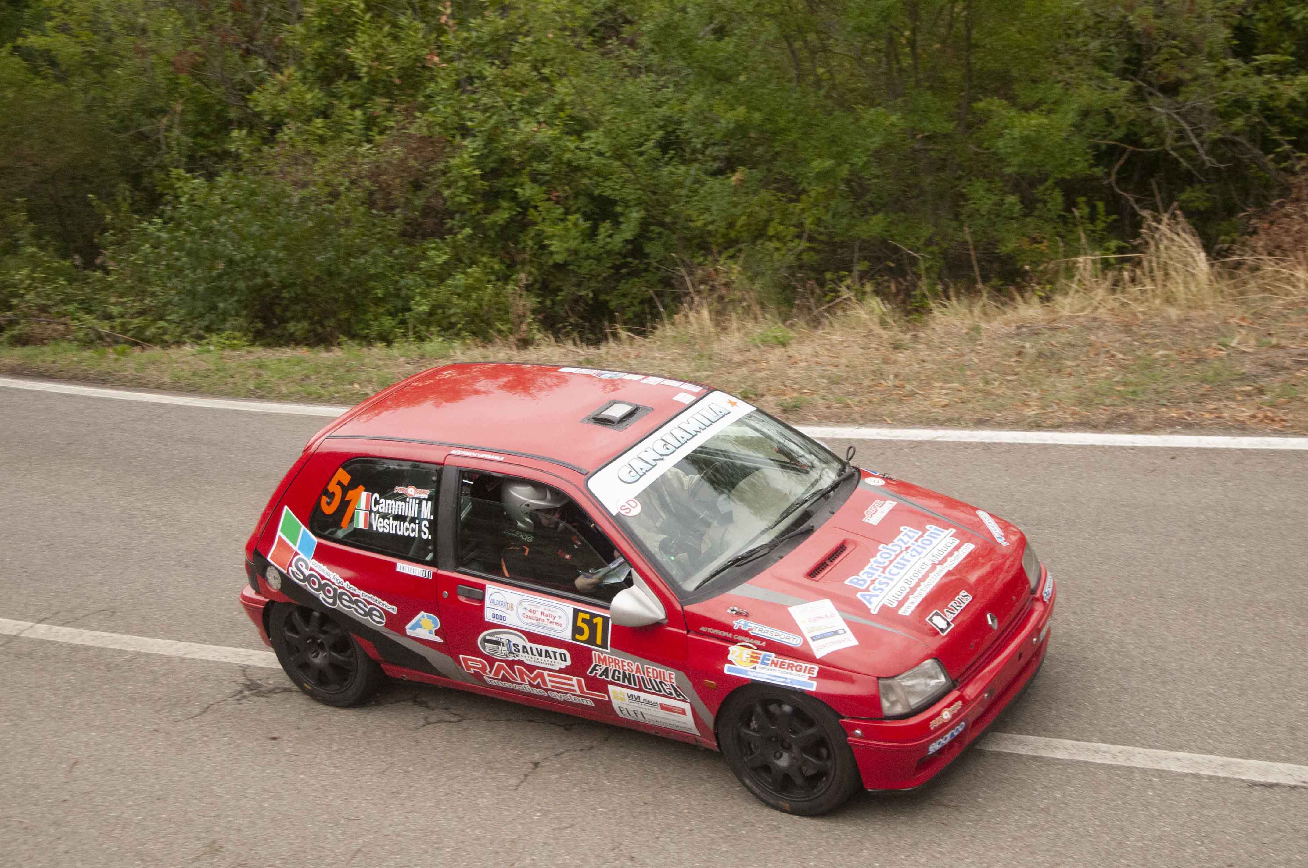 Il primo passaggio sui 12,89 km della “Montevaso” hanno invece posto fine alla gara sia di Maila Cammilli sia di Gianluca Martinelli, protagonisti in A7 ed entrambi a bordo di una Renault Clio Williams. La lady driver, affiancata da Sara Vestrucci alle note, si stava divertendo, ed il feeling con la vettura l’aveva vista iniziare la gara alla grande, con un ottimo riscontro cronometrico (vicino al podio di classe) sia nella prova notturna, sia nel primo impegno della domenica, nonostante un errore compiuto nell’affrontare una variante. A tradire l’equipaggio femminile è stata la pioggia incontrata nella prova seguente: una staccata ritardata, con gomme da asciutto, ha fatto scivolare la vettura in fossa, da dove non è stato possibile uscire. Un guasto meccanico, precisamente la rottura di un braccetto, è invece stata la causa del ritiro di Martinelli, con il poliedrico rallista lucchese impegnato a leggere le note di Maurizio Monti, al rientro dopo quattro anni di pausa e che, grazie anche al contributo del suo navigatore, stava occupando un’ottima terza piazza di classe: un fatto, quest’ultimo, che ha acuito ancor di più l’amarezza per il ritiro.