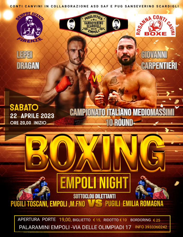 Rosanna Conti Cavini ha ultimamente collaborato con Cristiano Mazzoni nell’organizzazione di diversi titoli in Toscana e, nell’evento del 22 aprile, contano di riportare un titolo prestigioso a Empoli con il grande match che vedrà Dragan Lepei vs Giovanni “Mamba” Carpentieri per la conquista della seconda cintura iridata conquistata all’Estraforum di Prato, categoria supermedi, nel 2018.