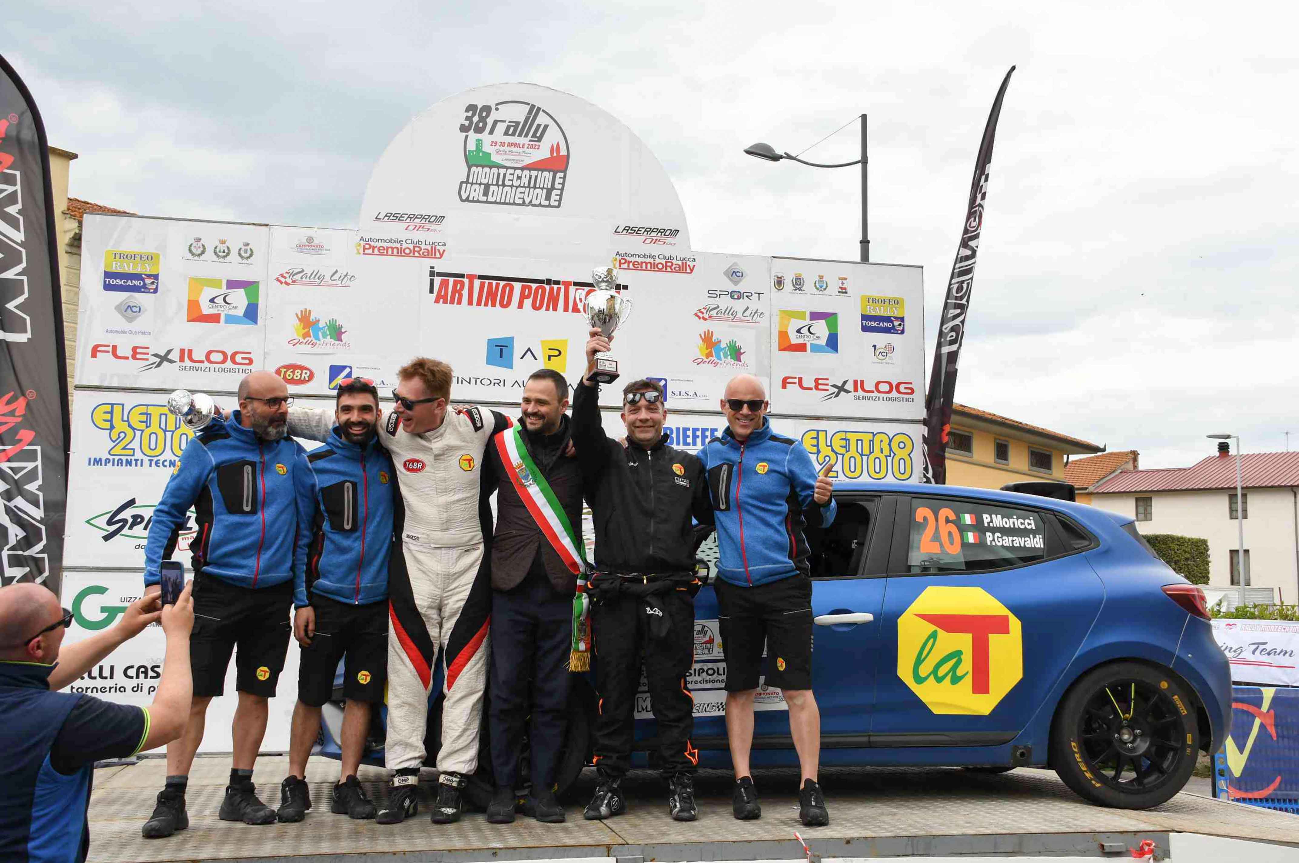 Nelle foto (free copyright Thomas Imagery): Paolo Moricci in azione con la vettura “griffata” La T Tecnica e la festa di fine gara sul palco di arrivo.