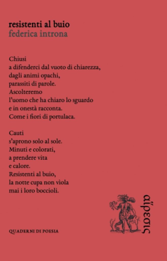 “Resistenti al buio” è la terza silloge poetica di Federica Introna; ancora una volta l’autrice dimostra un’ammirabile delicatezza e raffinatezza nel parlare lucidamente del nostro tempo, nel riecheggiare con lirismo ciò che è ormai perduto e nel cantare della resistenza alle avversità degli esseri umani, nonostante la loro incurabile condizione di fragilità.