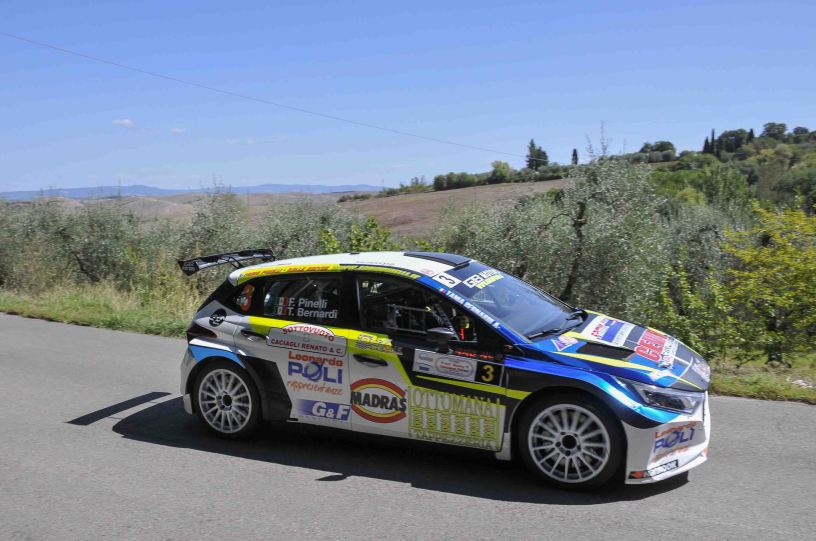 La gara del pilota valdinievolino, già dalla vigilia incentrata sull’ottenere i punti necessari alla certezza matematica del titolo, è stata condizionata da una scelta sbagliata di gomme per la prima tornata di prove della domenica, circostanza che lo ha allontanato dalla vetta. A quel punto, con la posizione ormai acquisita e l’annullamento dell’ultima prova speciale (a causa di un incendio), Pinelli ha badato a gestire la situazione ed arrivare al traguardo di Casciana Terme, con in mano comunque un posto nella top ten assoluta, il nuovo titolo da festeggiare, l’essere ancora in lotta per il podio di classe, sempre nella CRZ 7, e la leadership tra gli Over 55 anche nel Trofeo Rally Toscano.